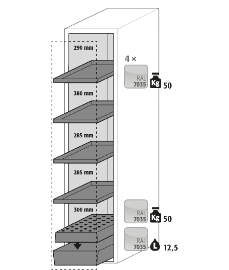 V90.196.045.VDAC:0012 modeli, sınırlı alanlar için tasarlanmış, EN 14470-1’e uygun ve CE ile GS belgelerine sahip güvenli saklama dolabıdır. Otomatik kapanma özelliğine sahip tek dikey çekmecesi, rafları ve StawaR uyumlu delikli yerleştirme plakası ile hem fonksiyonel hem de güvenlidir.