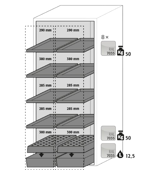 V90.196.081.VDAC:0012 modeli, laboratuvar beyazı rengi ve dikey çekmeceli sistemi ile hem estetik hem de fonksiyonel çözümler sunar. EN 14470-1 ve DIN EN 16121/16122 standartlarına uygun olarak test edilmiş, CE ve GS sertifikalı bu dolap; otomatik kapanma, kilit durumu göstergesi ve yüksek yük taşıma kapasitesi ile modern laboratuvarlar için üst düzey güvenlik sağlar.